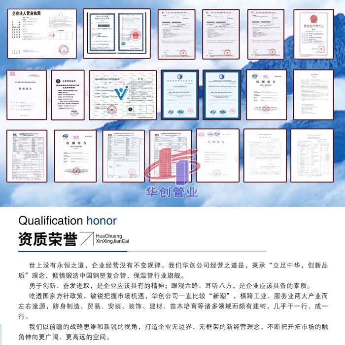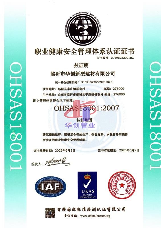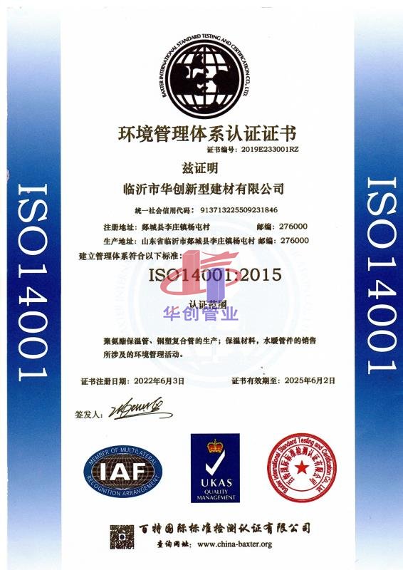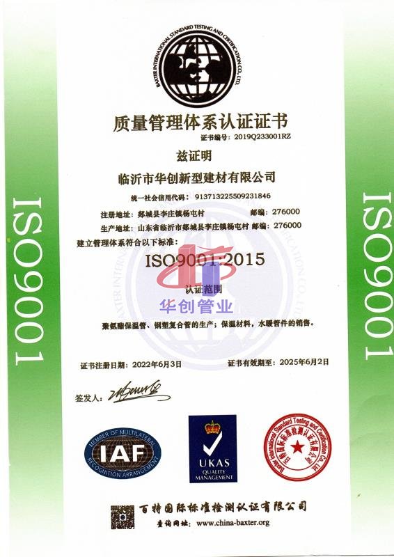 2014年8月27日,经北京中联天润证中心专业评估机构评价和国家认证认可监督管理委员会的专家组论证后,临沂市华创新型建材有限公司顺利通过“聚氨脂保湿管及许可范围内钢塑复合管的加工” 质量管理体系认证,并获得ISO9001:2008质量管理体系认证证书。