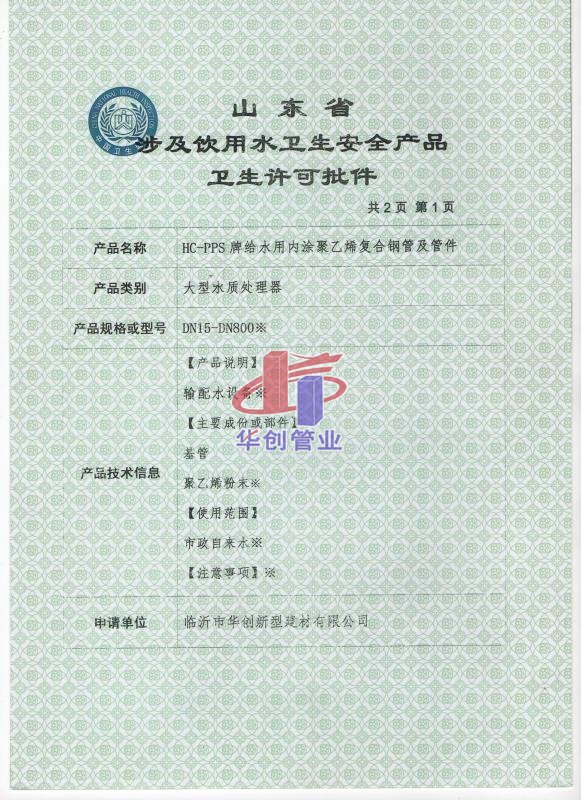2014年8月1日,经山东省卫生厅的专家组检验、论证后,临沂市华创新型建材有限公司顺利通过山东省饮用水许可认证,并获得“山东省涉及饮用水卫生安全产品卫生许可批件”。
